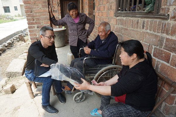 (图为兴娄担保副总经理谢祥国亲切询问贫困户家庭情况)